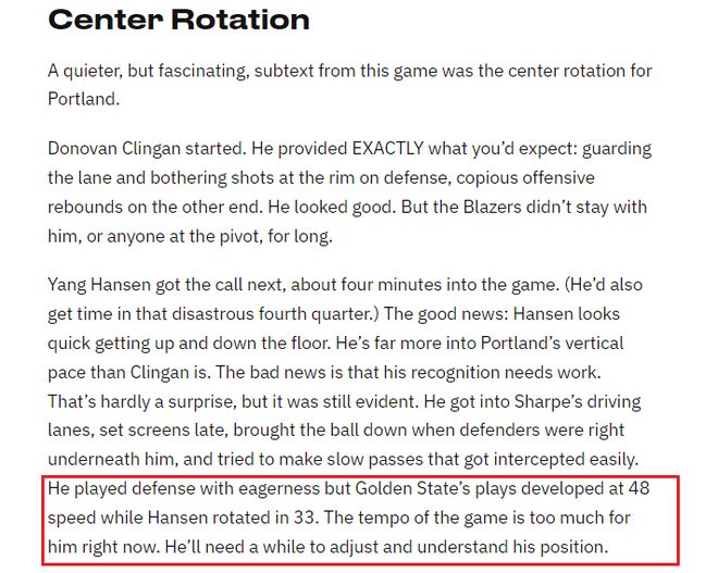 楊瀚森在比賽進(jìn)行了大約四分鐘左右替換上場。(在那災(zāi)難性的第四節(jié),他也獲得了上場時間。)好消息是:瀚森看起來跑動迅速。他比克林根更適應(yīng)開拓者的節(jié)奏。壞消息是,他的防守意識還有待提高。這并不令人意外,但仍然顯而易見。他在夏普的突破路線上設(shè)置掩護(hù)總是慢一拍,帶球時被防守球員緊緊跟隨。他嘗試進(jìn)行傳球,速度偏慢但很容易被攔截。他防守時很積極,但勇士隊(duì)的進(jìn)攻節(jié)奏以48的速率展開,瀚森則以33的速率輪換?,F(xiàn)在的比賽節(jié)奏對他來說太快了。他需要一段時間來調(diào)整和理解自己的位置。